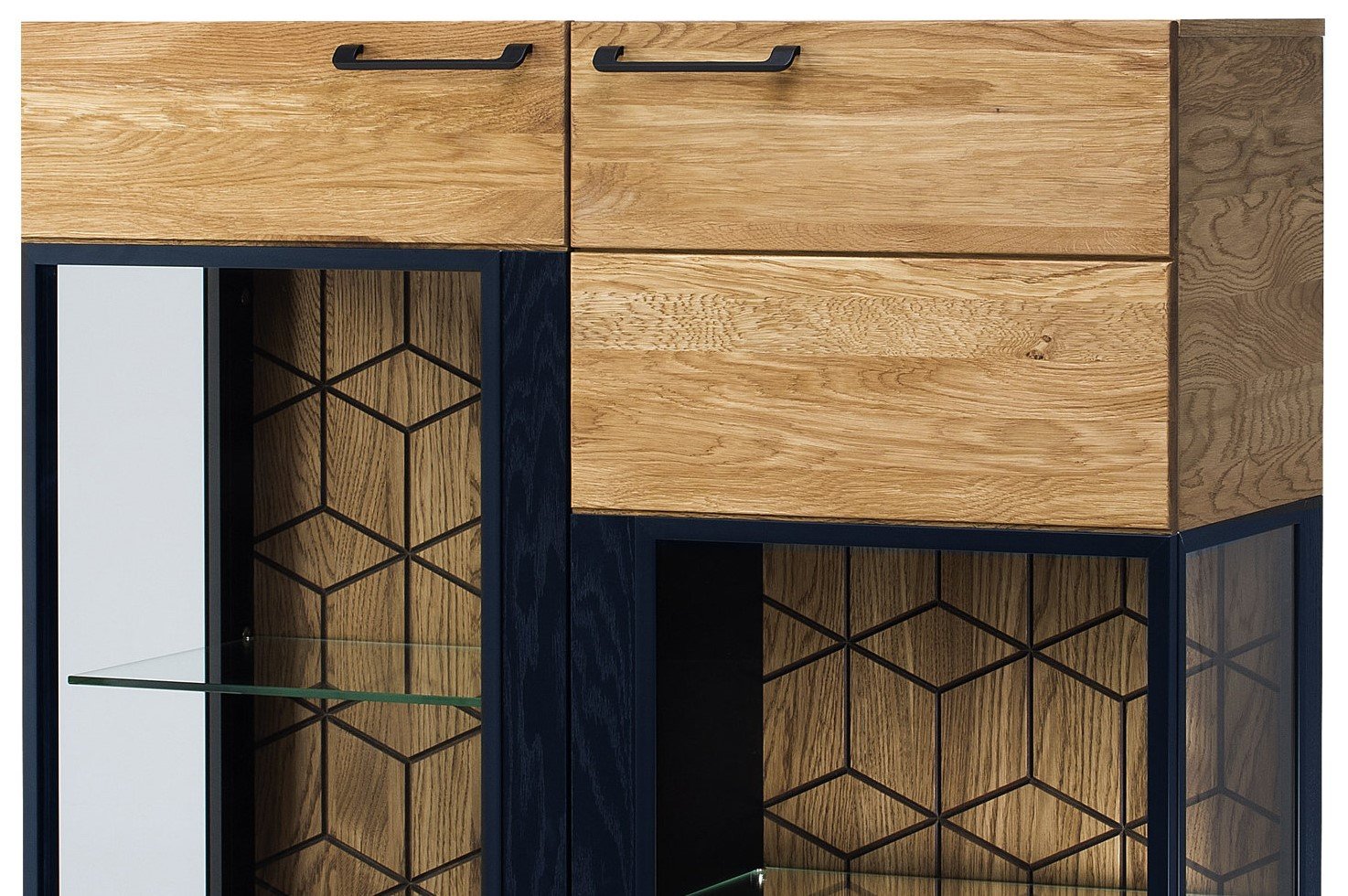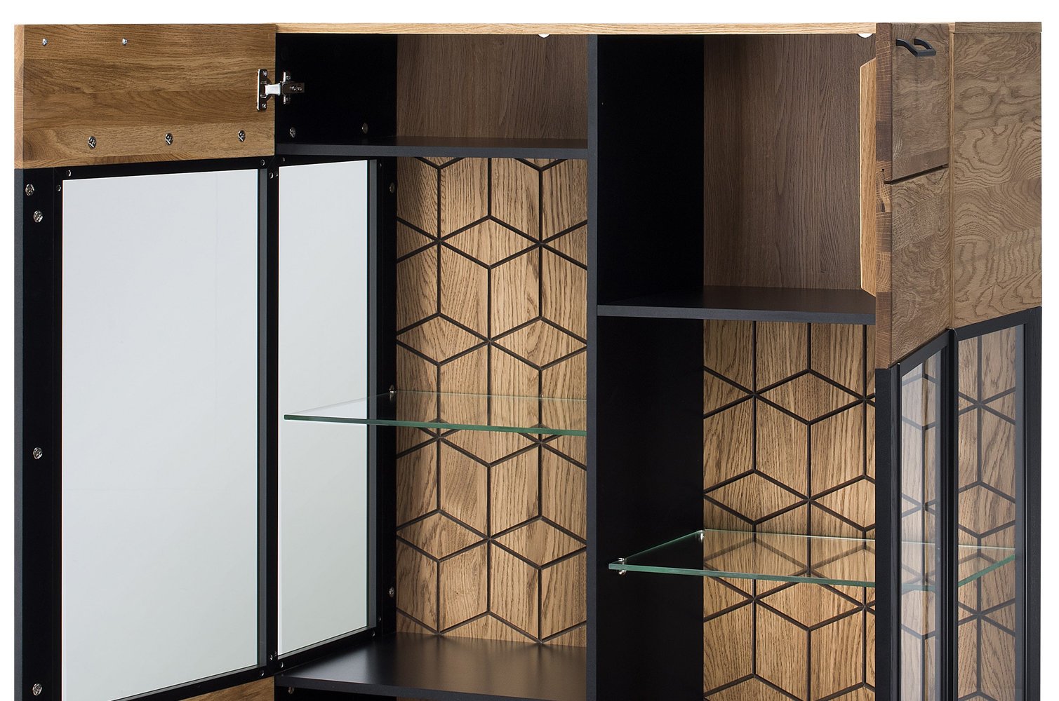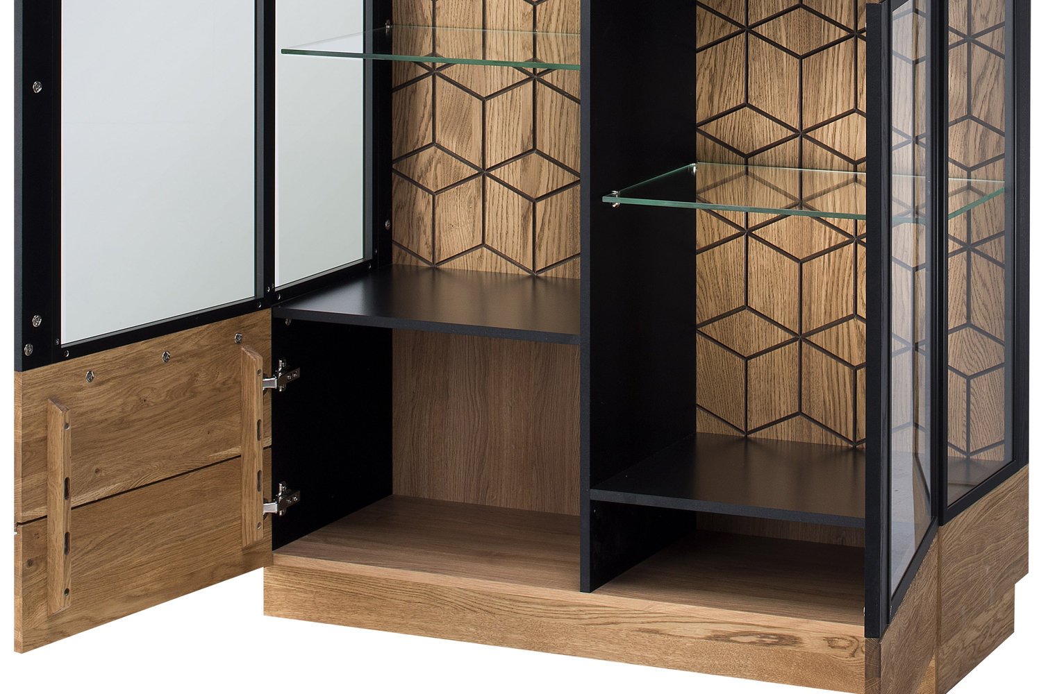 – 2 εσωτερικά γυάλινα ράφια και 4 ξύλινα, χωρισμένα στην μέση πίσω από κάθε φύλλο