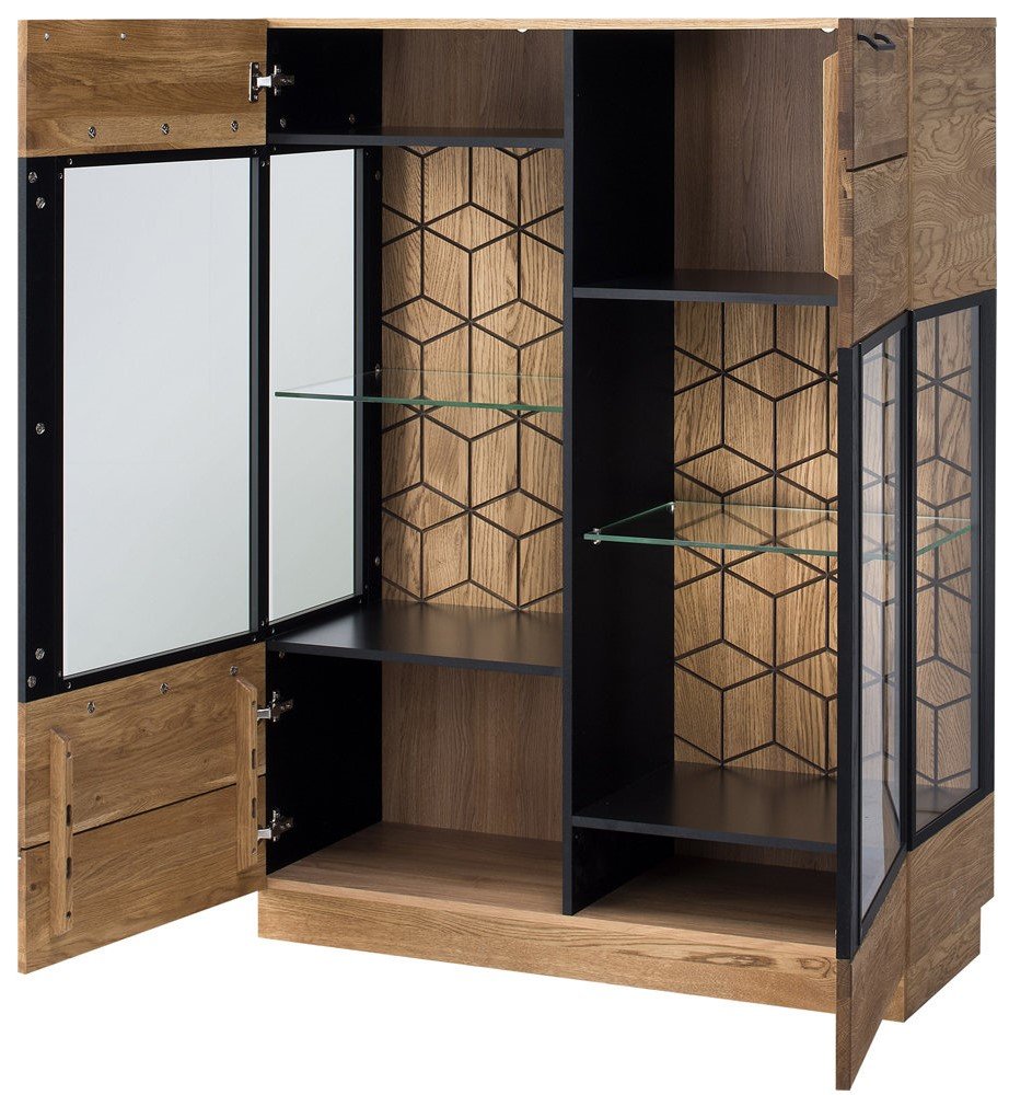 Οι γήινοι χρωματισμοί της βιτρίνας Rivina θα προσφέρουν μια φυσικότερη όψη στον χώρο του σαλονιού, ενώ θα δημιουργήσουν μια πιο ζεστή και φιλόξενη ατμόσφαιρα. Χαρακτηριστική λεπτομέρειά της αποτελούν τα χαραγμένα στο ξύλο εξάγωνα, που η γεωμετρική τους αρμονία διαμορφώνει μια εξαιρετική διακοσμητική προσθήκη. Ένας άψογος συνδυασμός της σύγχρονης αισθητικής με μια κλασσική χρωματική αντίθεση, που αναμφίβολα θα κλέψει τις εντυπώσεις.