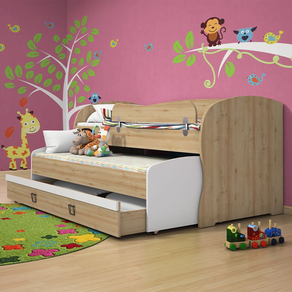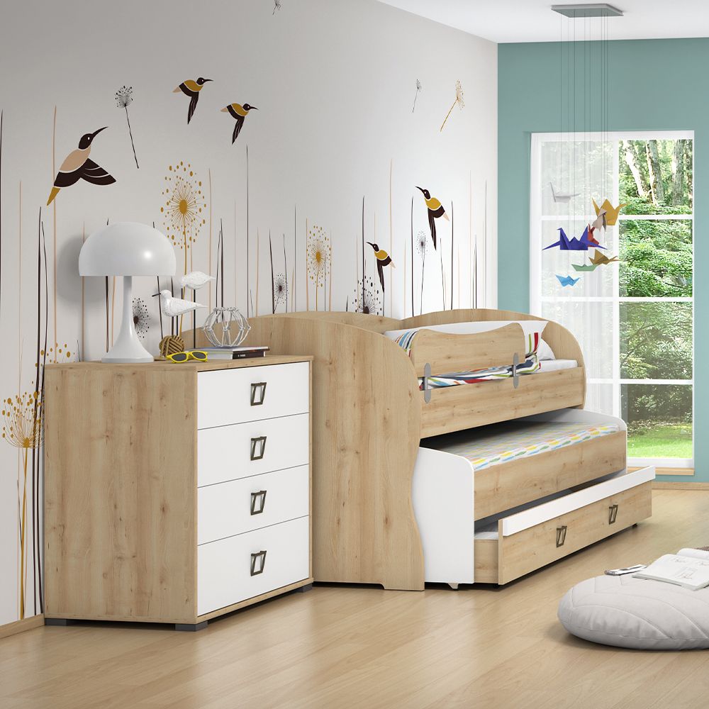 Κρεβάτι Riddle Plus, μινιμαλ σχεδιασμού με μοντέρνες λεπτομέρειες διχρωμίας, με προστατευτικό κάγκελο, πρακτικές διαστάσεις και δεύτερο κρεβάτι με ροδάκια στο κάτω μέρος.