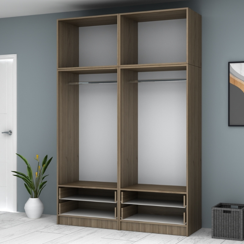 • Στο εσωτερικό της φέρει δύο μεταλλικές βέργες για κρεμάστρες. Στο κάτω μέρος φέρει τέσσερα πρακτικά συρόμενα συρτάρια.