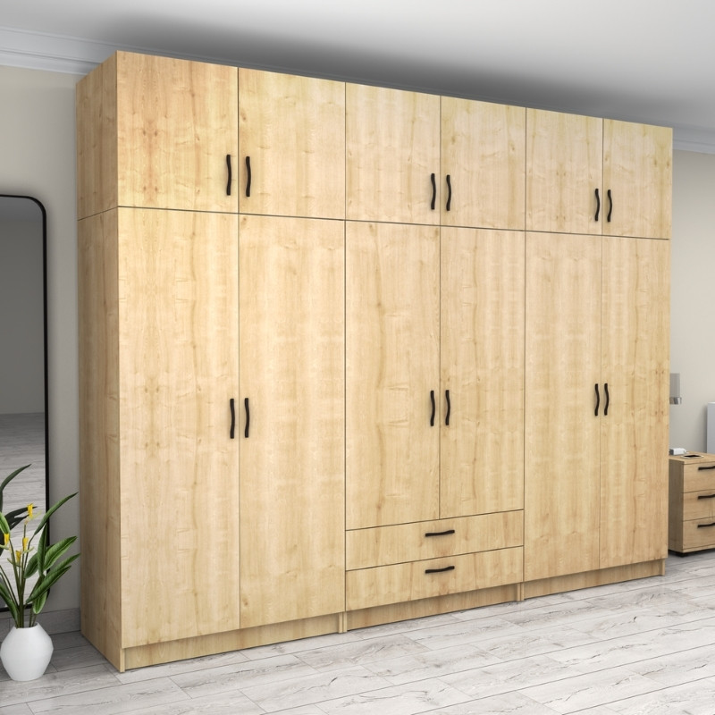 Ντουλάπα ρούχων Victoria Megapap εξάφυλλη με πατάρι και συρτάρια χρώμα φυσικό οξιάς 300x60x240εκ.