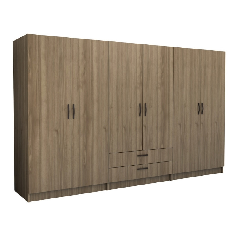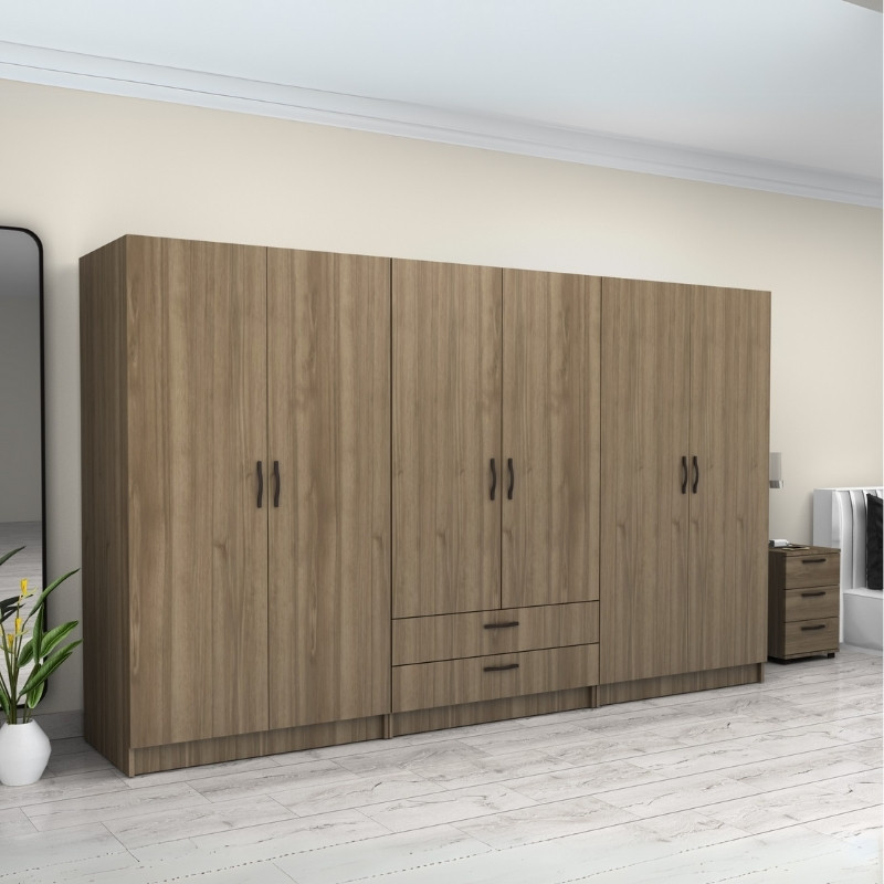 Ντουλάπα ρούχων Victoria Megapap εξάφυλλη με συρτάρια χρώμα καρυδί 300x60x181εκ.