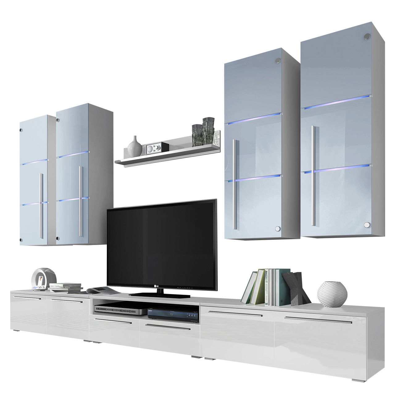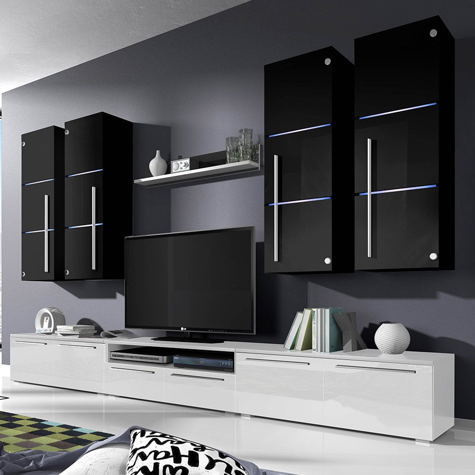– Περιλαμβάνει 1 βάση τηλεόρασης με ντουλάπια και ράφι,2 βάσεις τηλεόρασης με ντουλάπια, 4 κρεμαστά ντουλάπια και 1 ράφι